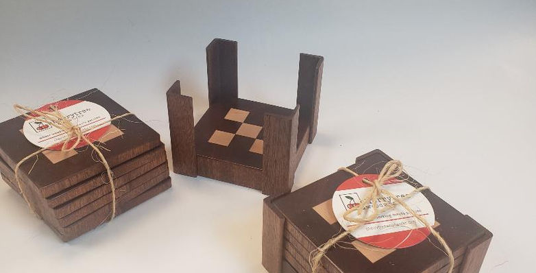 The end grain design makes it possible to have unique and intricate patterns. These are sold in six and four coaster sets with a matching holder.